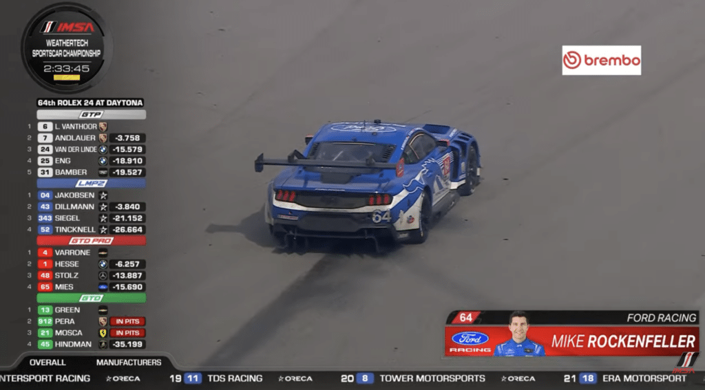 Guardando alle GT, doppietta Ford nella classe GTD Pro. In GTD, la #34 Ferrari Conquest Racing è al terzo posto. Ritirata ufficialmente la #62 Ferrari Risi Competizione.